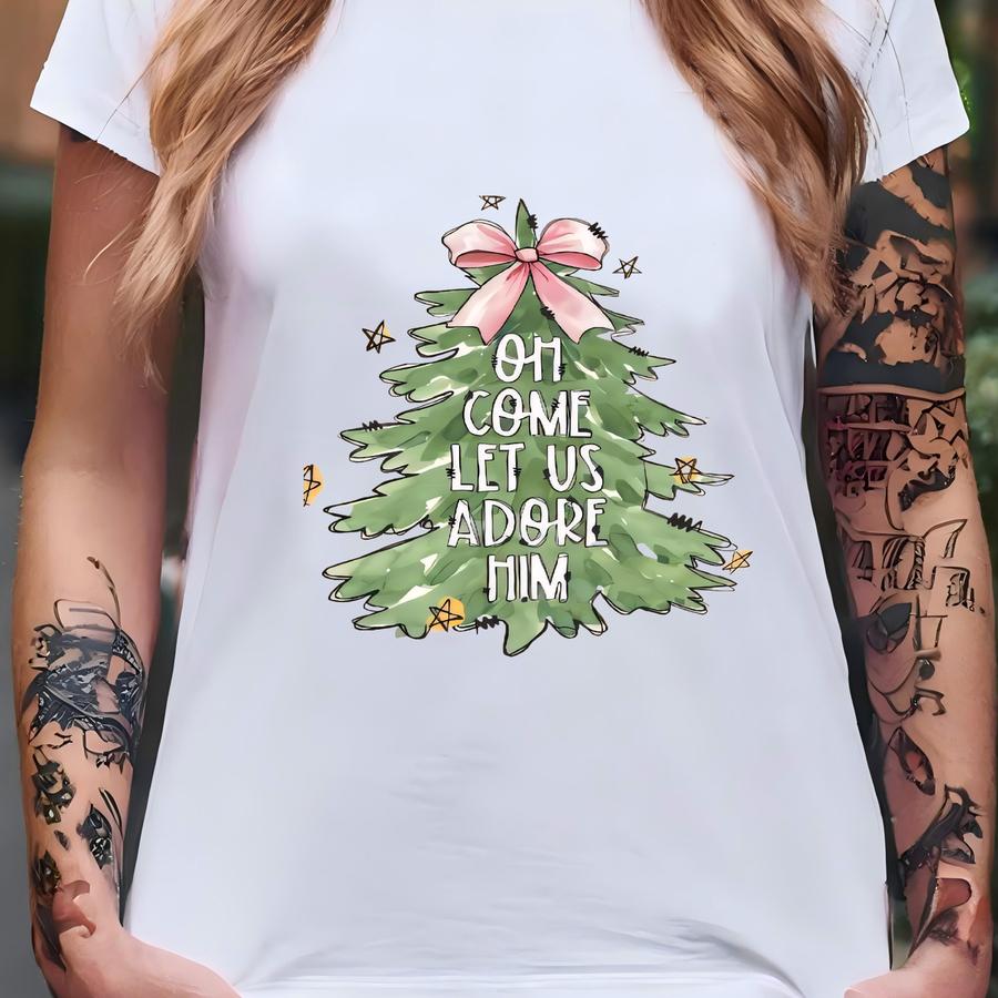 Oh Come Let Us Adore Him Kids Christmas Shirt, Christian Christmas Toddler Tee, Christmas Tree Hoodie, Girls Holiday Tee, Pink Bow Tree T-shirt