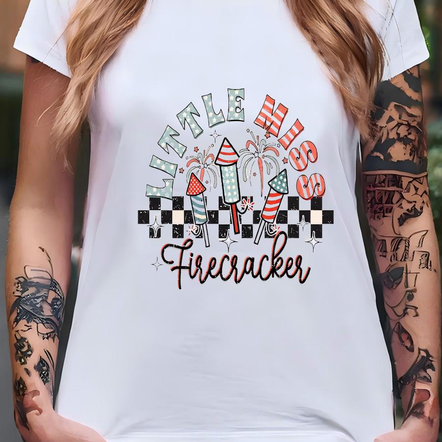 Little Miss Firecracker Baby ®, Funny 4th Of July ® For Girls, Independence Day, Retro Patriotic ®, Fireworks, Checkered T-shirt