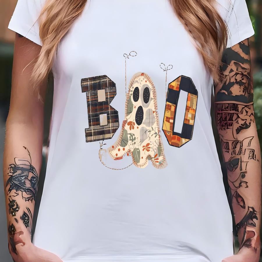 Halloween Boo Faux Stitched Tee | Fall Sweatshirt | Patchwork Print Ghost Crewneck T-shirt