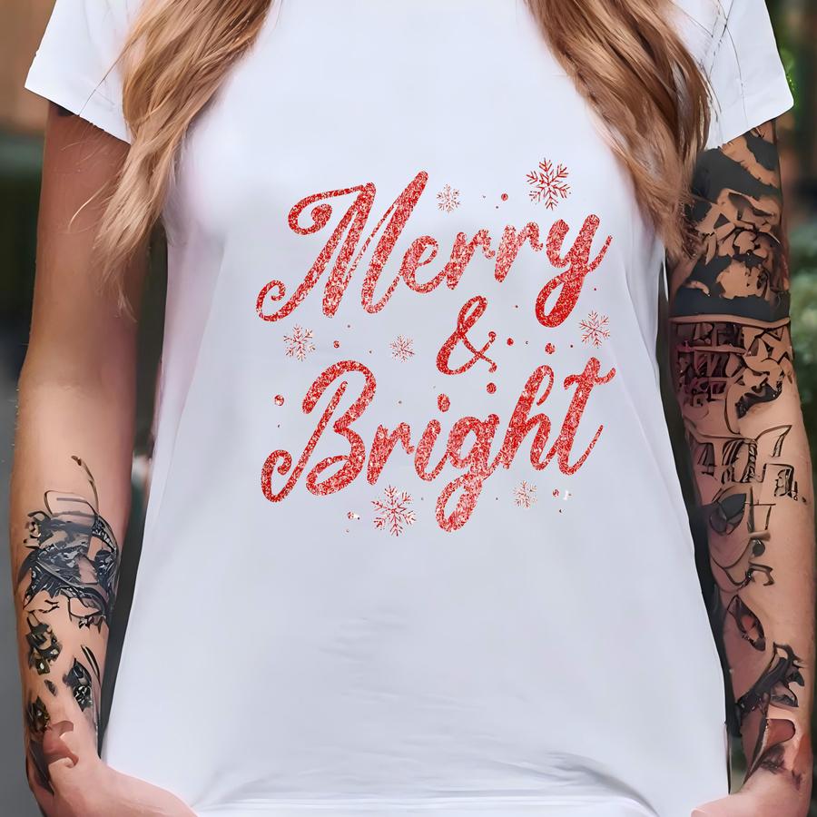 Faux Sparkly Glitter Merry And Bright Christmas Sweatshirt - Holiday Party Crewneck Sweater, Coquette Jesus Christmas Tee T-shirt