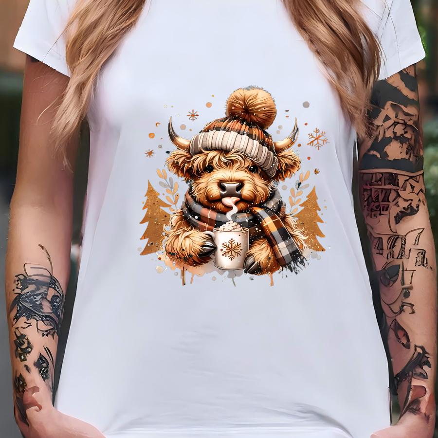 Highland Cow Christmas Shirt | Cozy Hot Cocoa Plaid Scarf Holiday Sweatshirt T-shirt