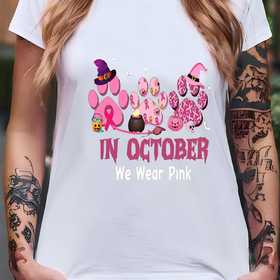 In October We Wear Pink Dog Paws Shirt,halloween Breast Cancer Shirt,breast Cancer Awareness Shirt,pink Ribbon Tee,breast Cancer Support Ift T-shirt