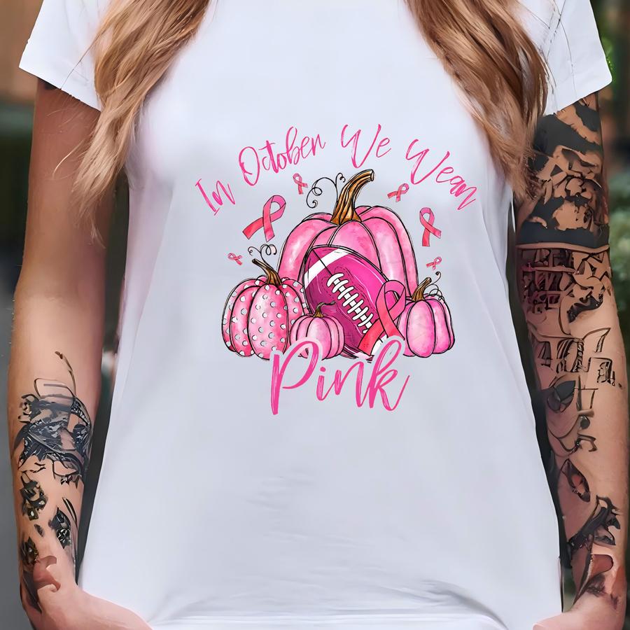 In October We Wear Pink Sweatshirt,retro Pumpkin Football Shirt,breast Cancer Awareness Fighter Shirt,coquette Pink Bow Ribbon Breast Cancer T-shirt