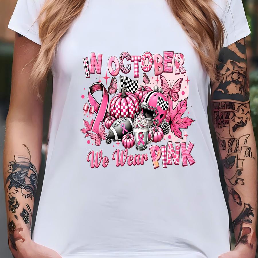 In October We Wear Pink Sweatshirt, Breast Cancer Awareness, Pink Ribbon Shirt,cancer Survivor,checkered Pumpkin Tee, Breast Cancer Football T-shirt
