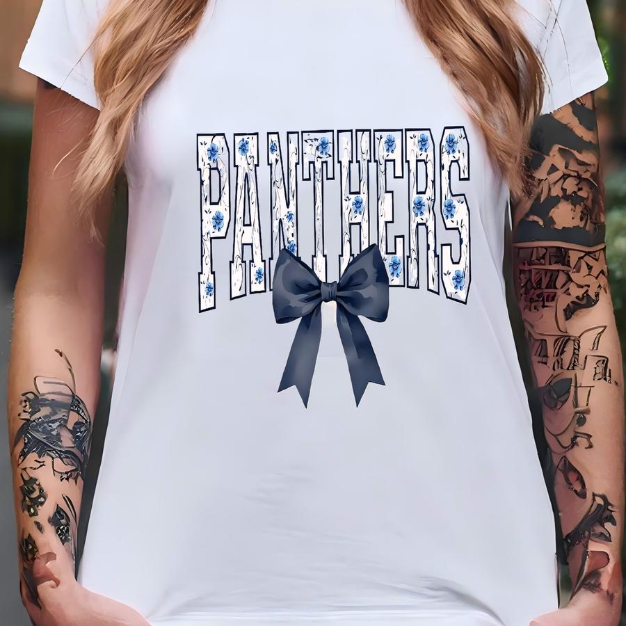 Panthers With Blue Bow Shirt, School Spirit Coquette Tee, Panthers Mascot Floral Bow Tshirt, Game Day Panthers Football Tee. T-shirt
