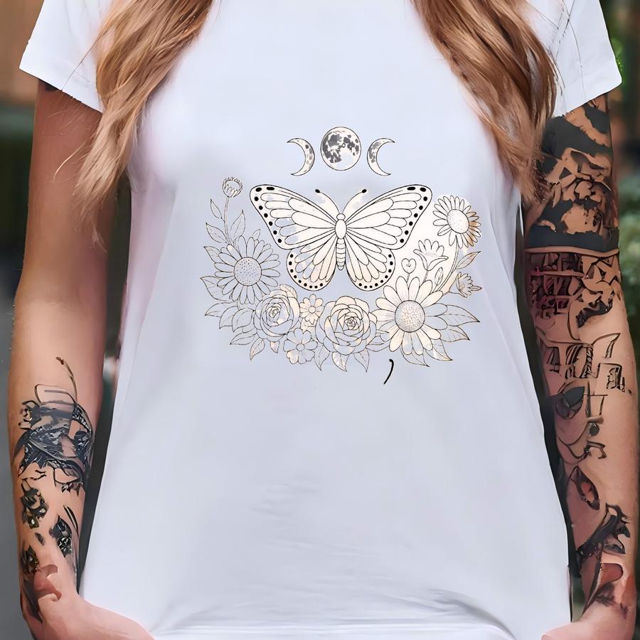 Embrace Change Butterfly Shirt, Moon Phase Floral Tee, Positive Vibes Gift, Nature Lover Apparel, Inspirational Quote Top, Boho Style Shirt T-shirt