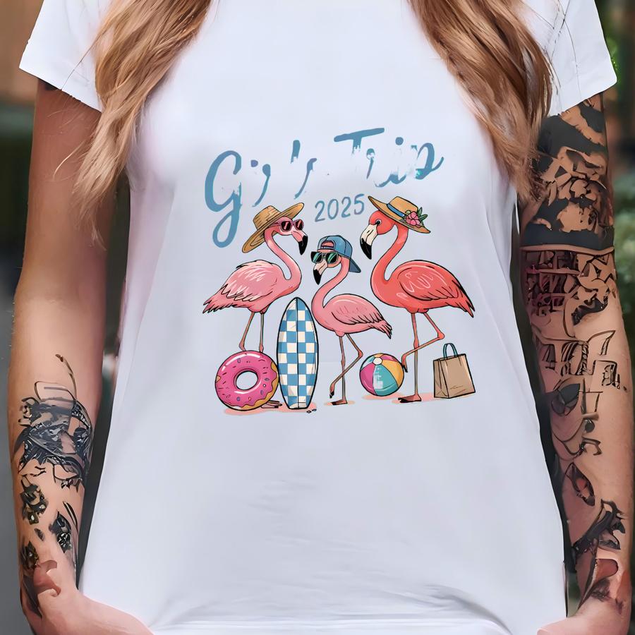 Girls Trip 2025 Flamingo Shirt, Matching Girls Getaway Tee, Tropical Vacation Group Shirt, Flamingo Beach Crew Shirt, Summer Fun Trip Shirt T-shirt