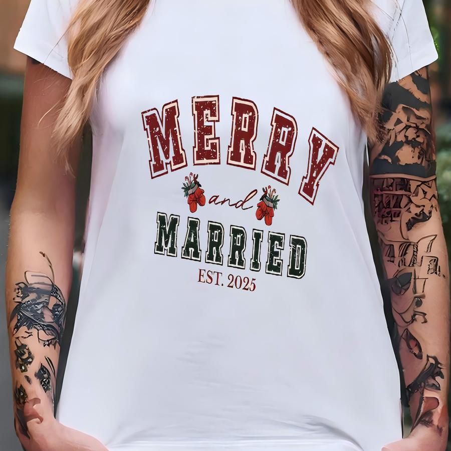 Merry And Married Sweatshirt, Christmas Newlywed Matching Couple Sweaters, Christmas Wedding Sweater, Christmas Couple Shirts T-shirt
