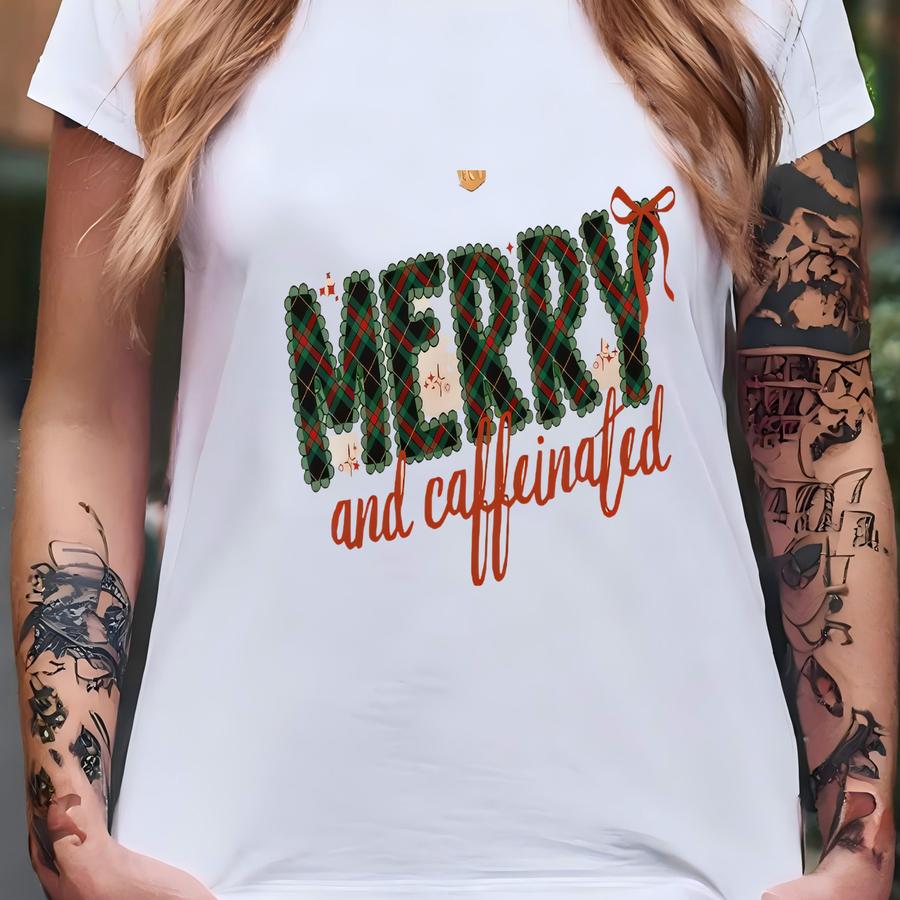 Merry And Caffeinated Sweatshirt Christmas Coffee Lover Crewneck Holiday Cozy Outfit Funny Christmas Shirt Merry And Bright Coffee Shirt T-shirt