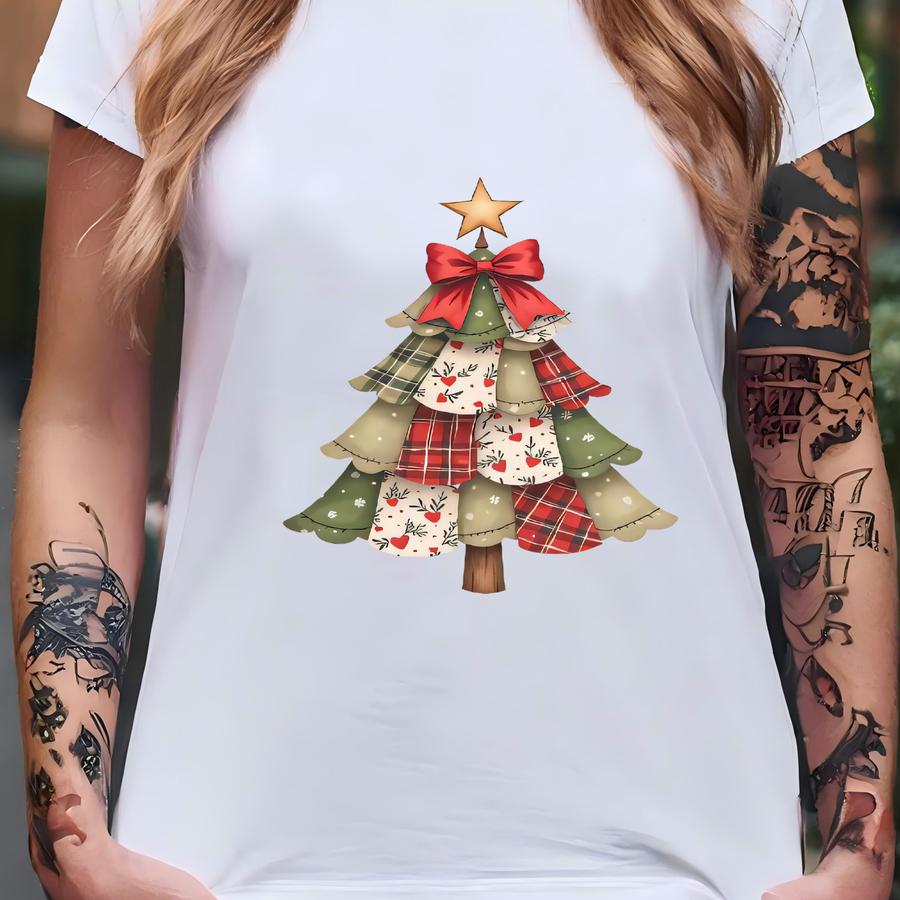Patchwork Christmas Tree Sweatshirt Cozy Holiday Crewneck Vintage Faux Quilted Tree Sweatshirt Retro Christmas Outfit Festive Gift For Her T-shirt