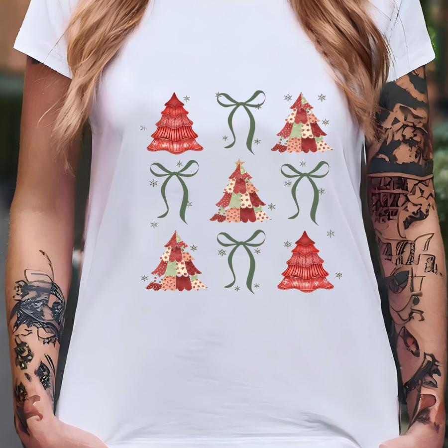 Patchwork Christmas Tree Sweatshirt With Coquette Bows Vintage Cottagecore Holiday Crewneck Retro Cozy Christmas Gift For Her Coquette Shirt T-shirt