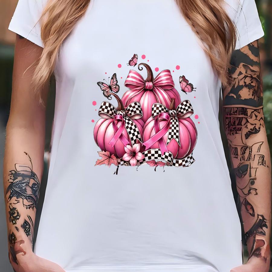 In October We Wear Pink Shirt, Retro Pumpkin Shirt, Breast Cancer Awareness Fighter, Coquette Pink Bow Ribbon Breast Cancer T-shirt