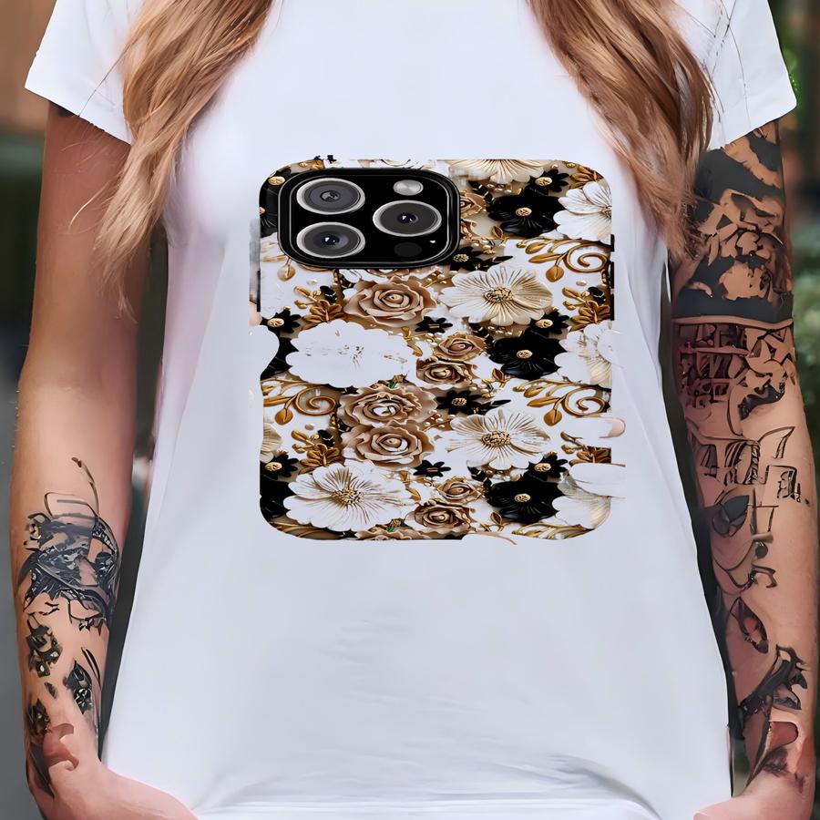 Elegant 3d Floral Black Gold Phone Case, Iphone 17 16 15 14 13 12 11 Pro Max Plus, Google Pixel 9 8 7 6 5 4, Black Cream Flower Phone Cover T-shirt