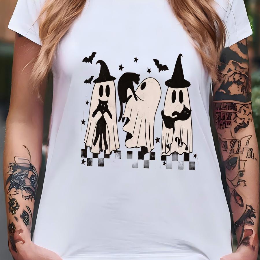 Halloween Cat Ghost Shirt Funny Ghosts With Black Cats Witch Hat Tee Retro Spooky Season Shirt Gift For Cat Lovers T-shirt