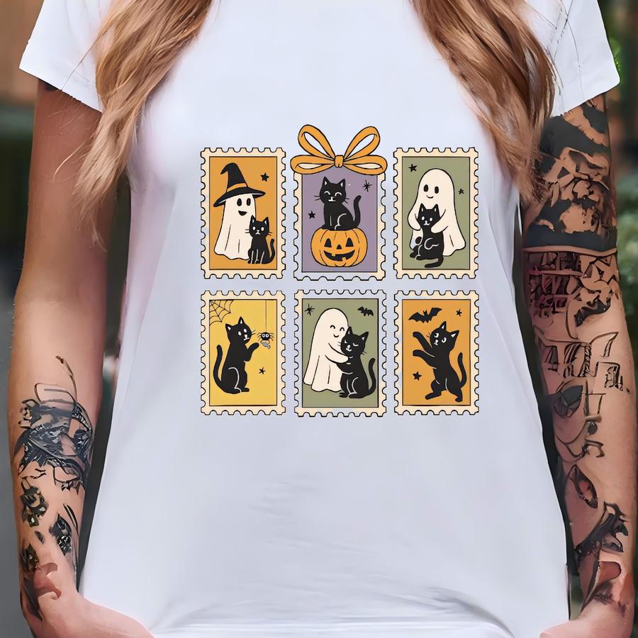 Halloween Shirt Toddler Black Cat Ghost Stamp Tee Cute Spooky Season Fall Tshirt Retro Cat Lover Kid Shirt Halloween Outfit Toddler T-shirt