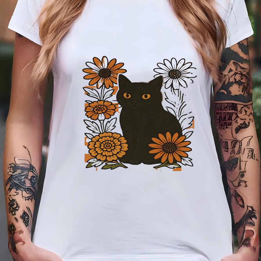 Halloween Shirt Black Cat And Floral Tee Fall Aesthetic Spooky Season Shirt For Cat Lovers Autumn Checkerboard Gift Idea T-shirt