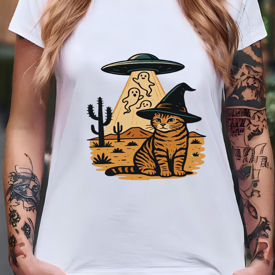 Halloween Cat Shirt Ufo Cowboy Tee Witch Cat Ghost Western Desert Alien Shirt Funny Fall Spooky Season Shirt For Cat Lovers T-shirt