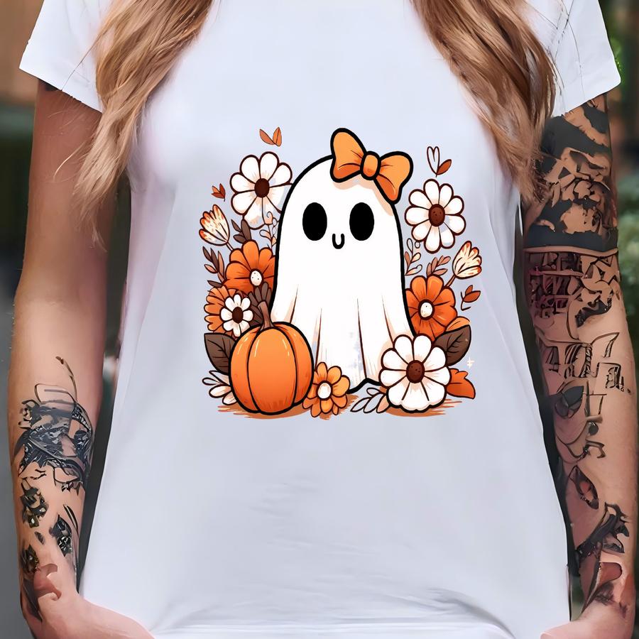 Fall Tee, Cute Ghost With Flowers Pumpkin, Ghost Fall Shirt, Premium Unisex Shirt, 3 Color Choices, 3x Halloween, 4x Halloween, Plus Sizes T-shirt