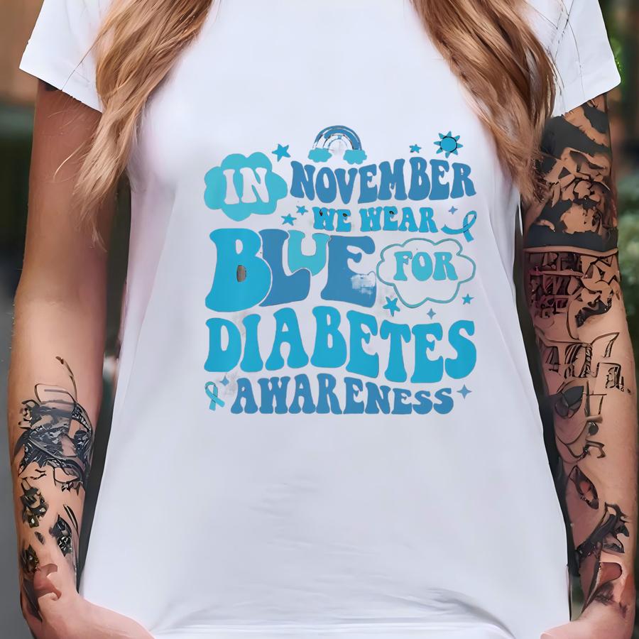 In November We Wear Blue For Diabetes Awareness Shirt: Sugar-free Month Tee, Diabetes Support Shirt, Blue Ribbon Hoodie T-shirt