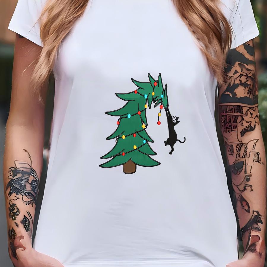 Meowy Christmas Cat Tree Sweatshirt: Funny Black Cat Holiday Lights Sweatshirt | Cute Christmas Tree Pet Lover Gift T-shirt